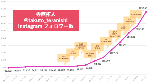最後に寺西さんについて語るうえで、「Instagramのフォロワー増加率」についても触れておきたい。寺西さんのInstagramはtimelesz project参加前は5万人程度だったが、そのあとものすごい勢いで増加して、今日現在44万人を超えている。これはtimelesz project公式アカウントのフォロワーの人数すらも超えている。そのフォロワー数推移をまとめたので最後に貼り付けておく。
